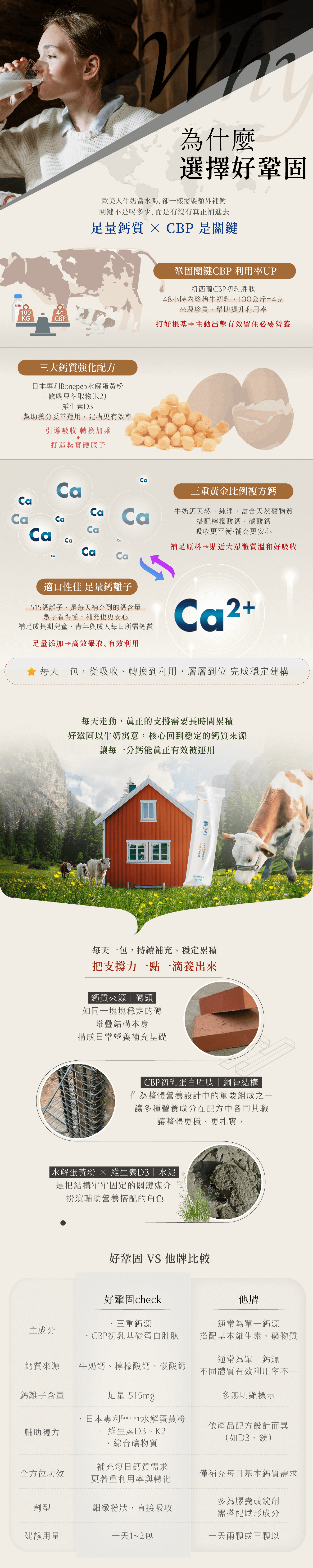 CBP 為初乳來源的蛋白胜肽成分,常見於營養補充品配方中。在好鞏固的配方設計中,CBP 與多重鈣源一同搭配,作為整體營養結構的一部分,讓鈣補充的配方更完整。